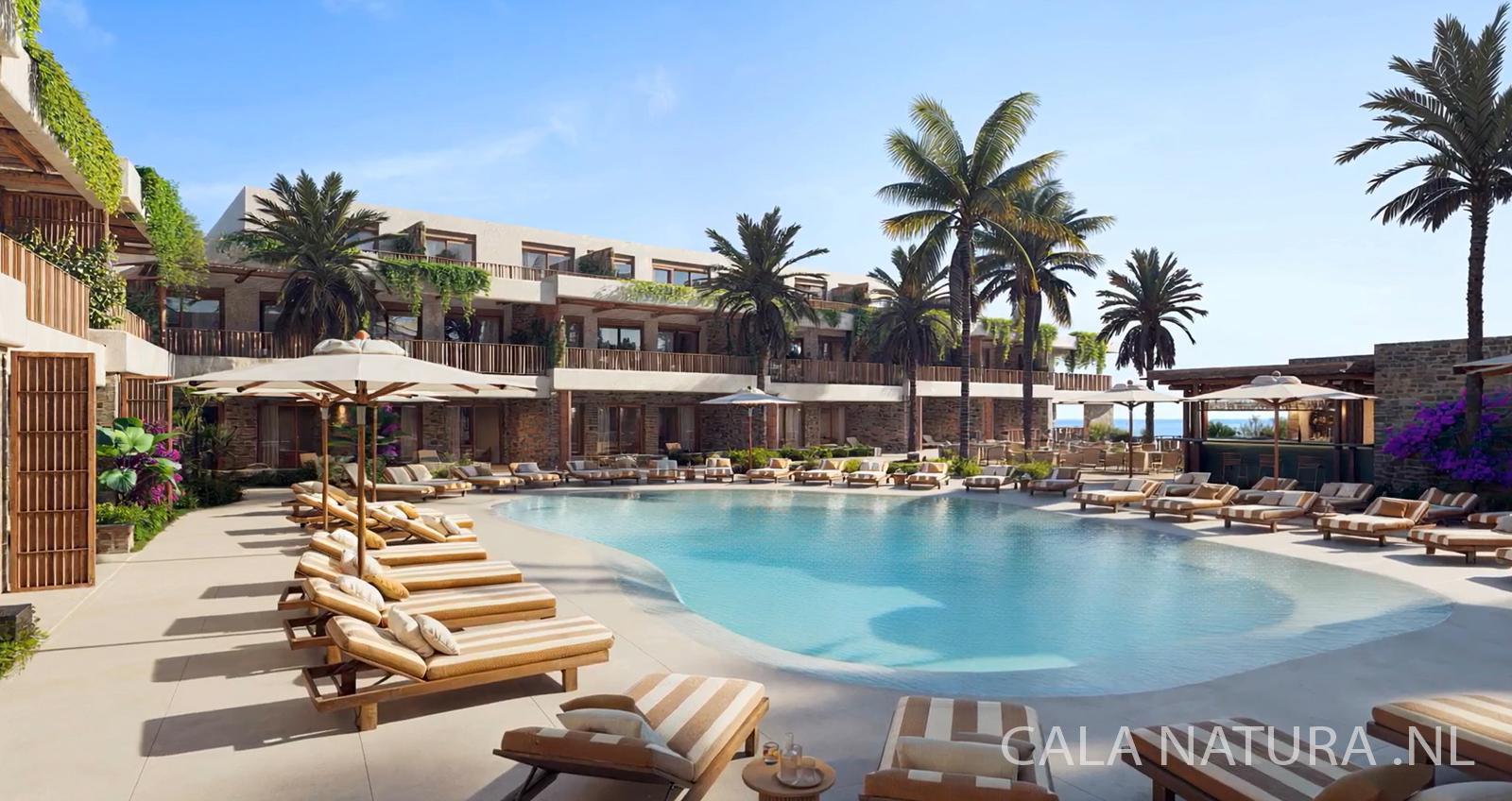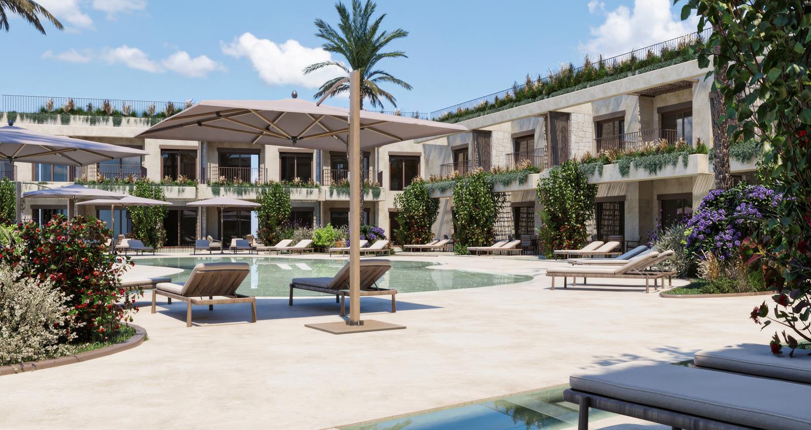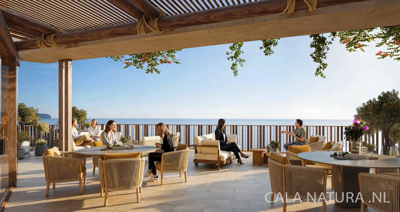 Het privéterras op de tweede verdieping is waar deze appartementen hun unieke waarde tonen. Met 18 tot 24 m² royale buitenruimte geniet je van het meest gewilde uitzicht van Cala Natura: zwembad én zee in één panoramisch beeld.