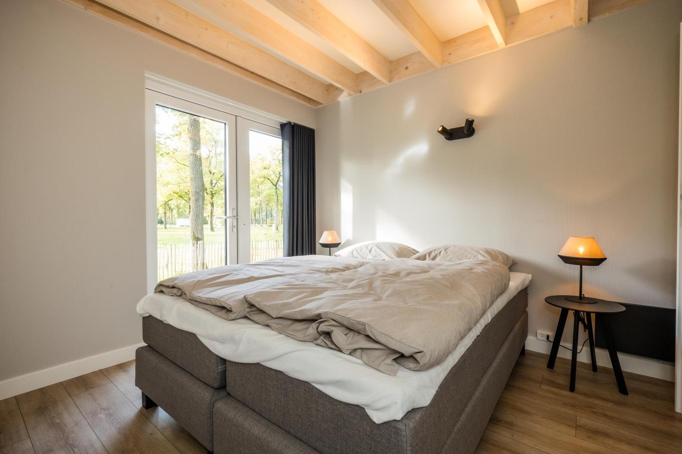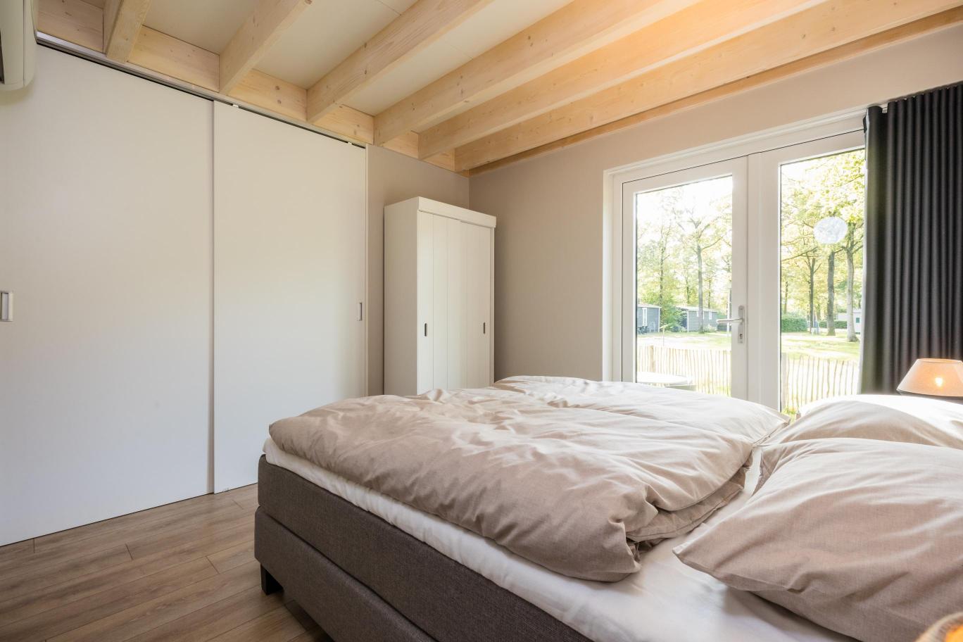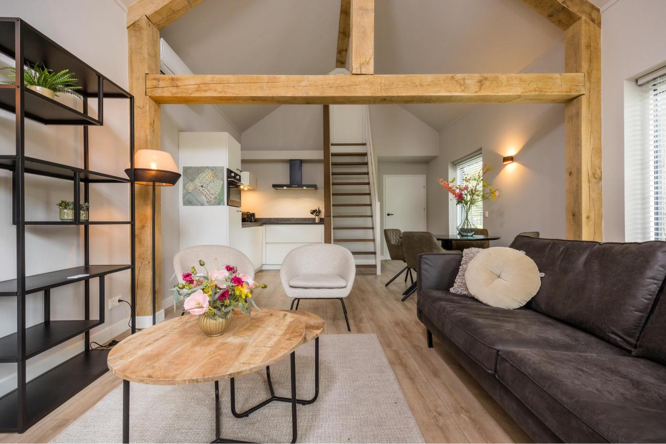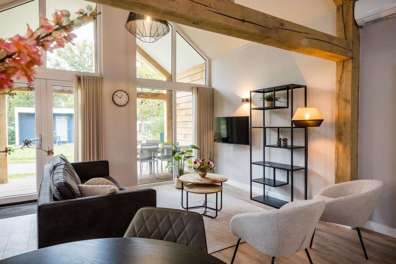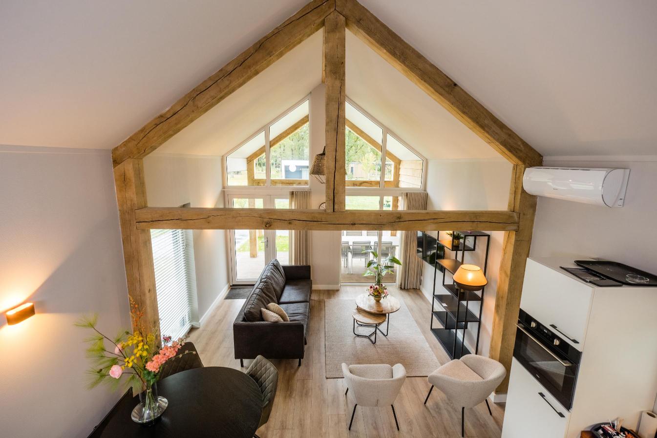 Woningtype Vecht is een sfeervolle en royale 4-persoons recreatiewoning met karakteristieke eikenhouten gebinten, een hoge nok en een riante woonkamer.