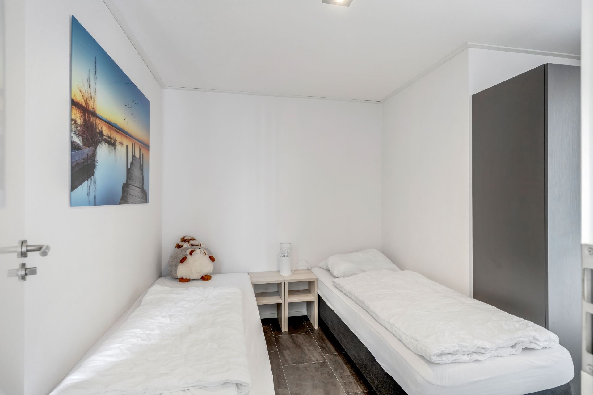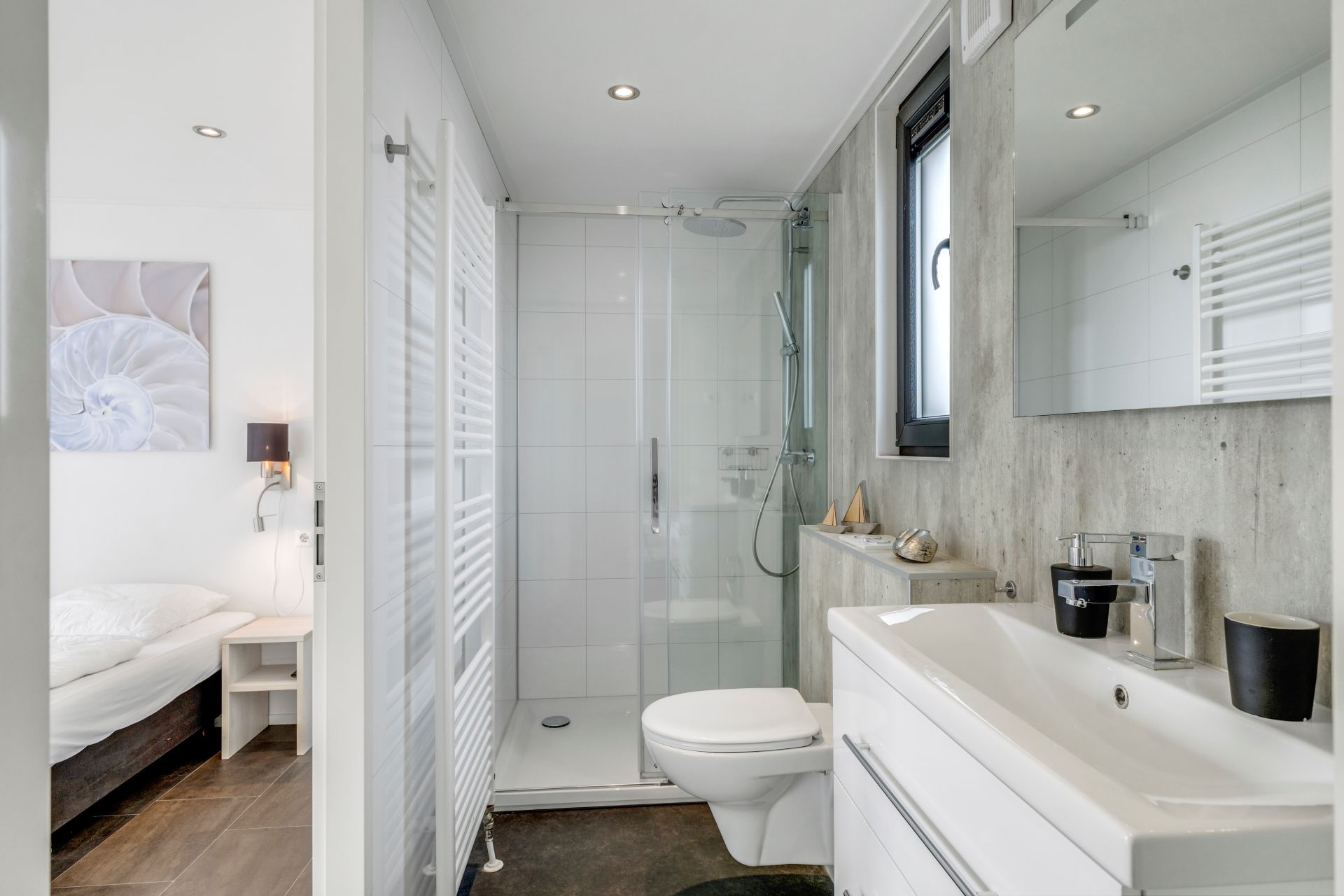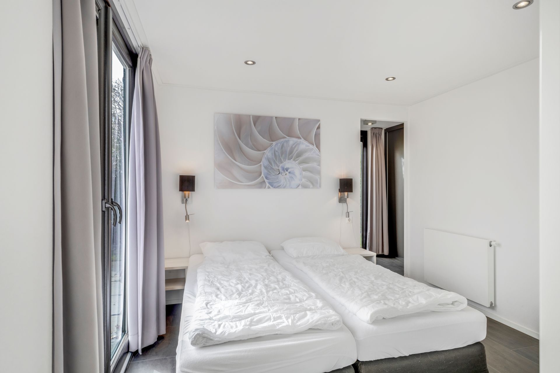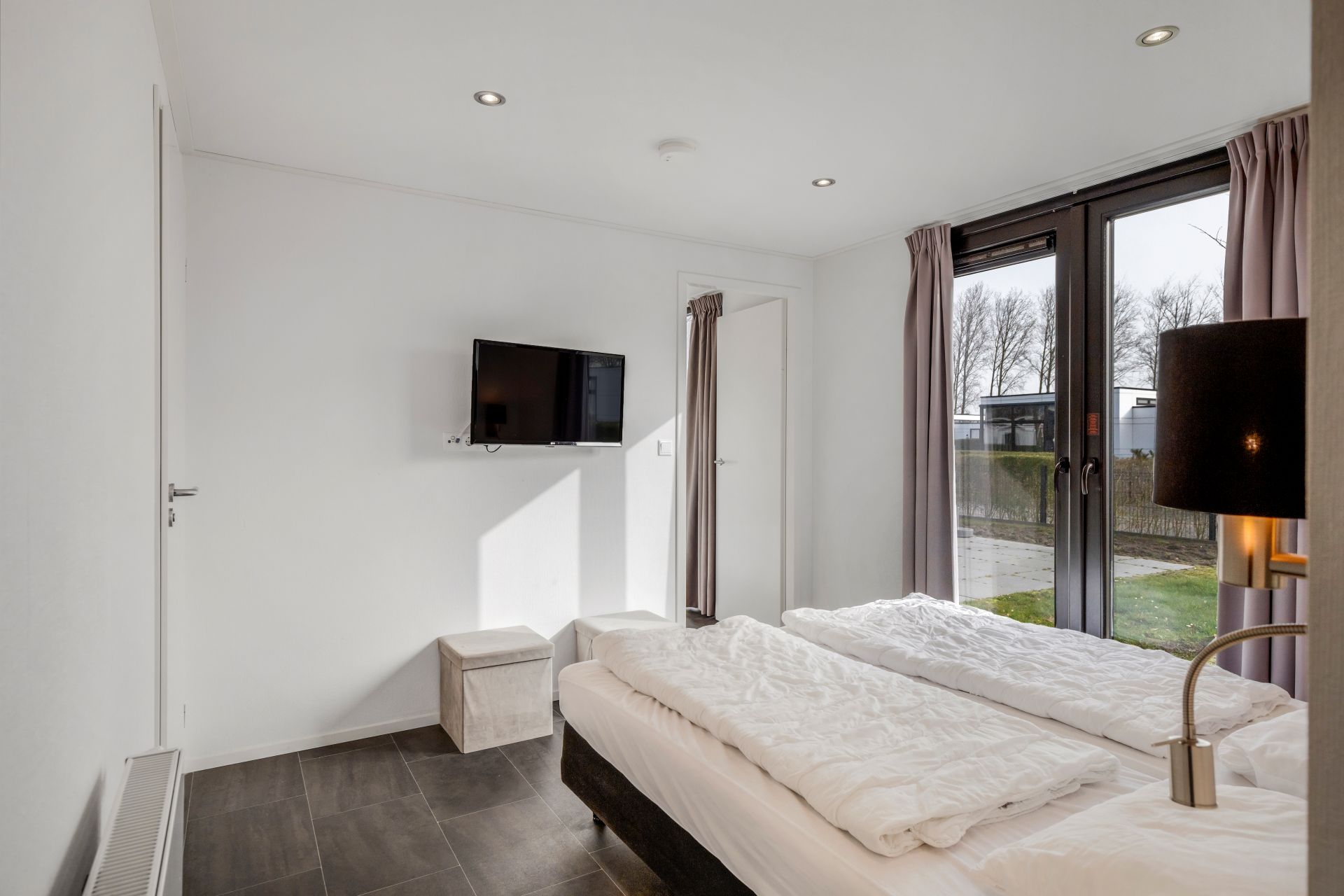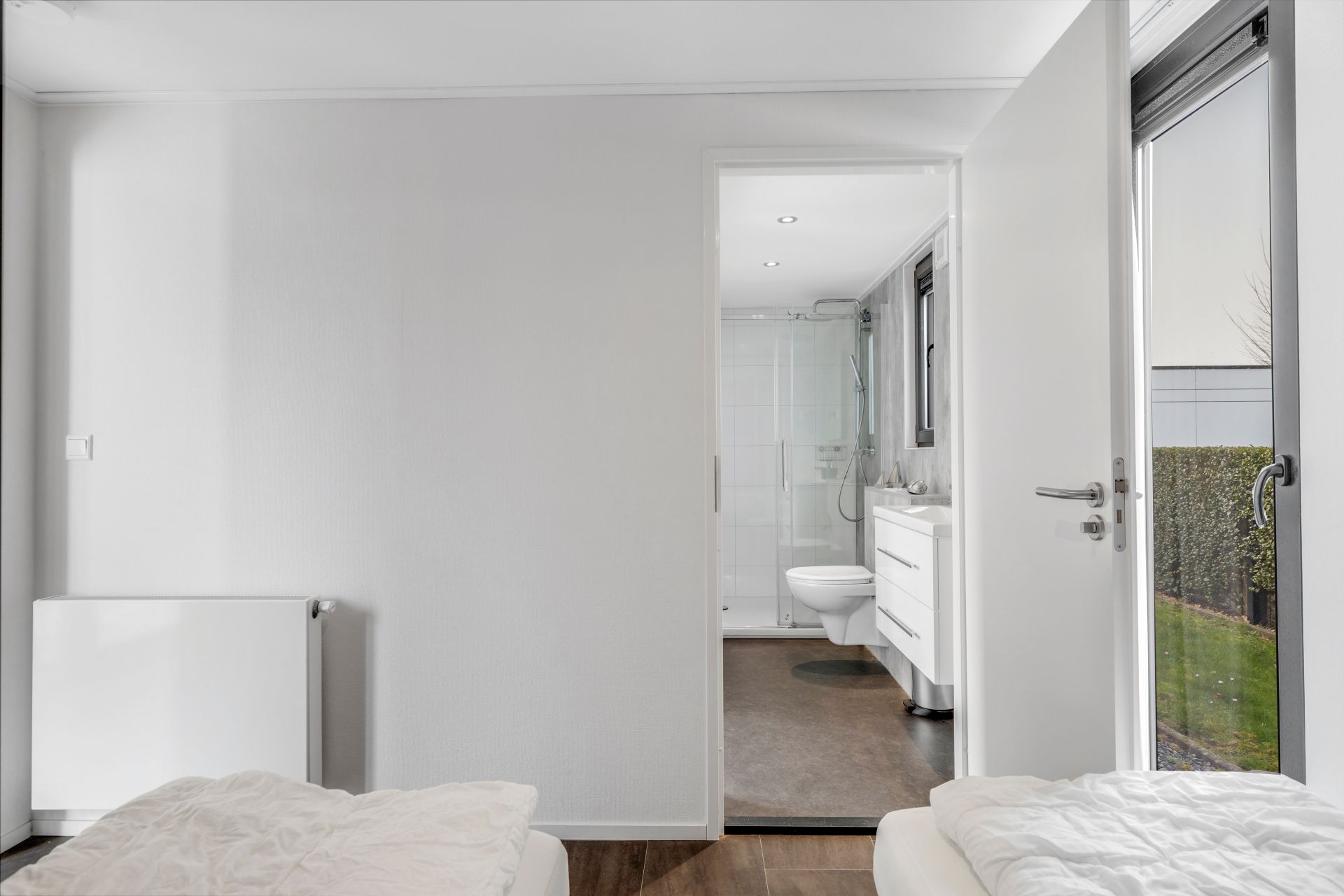 Via de hal bereikt u het separate toilet en twee slaapkamers. De ruime hoofdslaapkamer beschikt over een televisie en een badkamer en suite met inloopdouche, toilet en wastafelmeubel. De tweede slaapkamer heeft eveneens toegang tot deze badkamer.