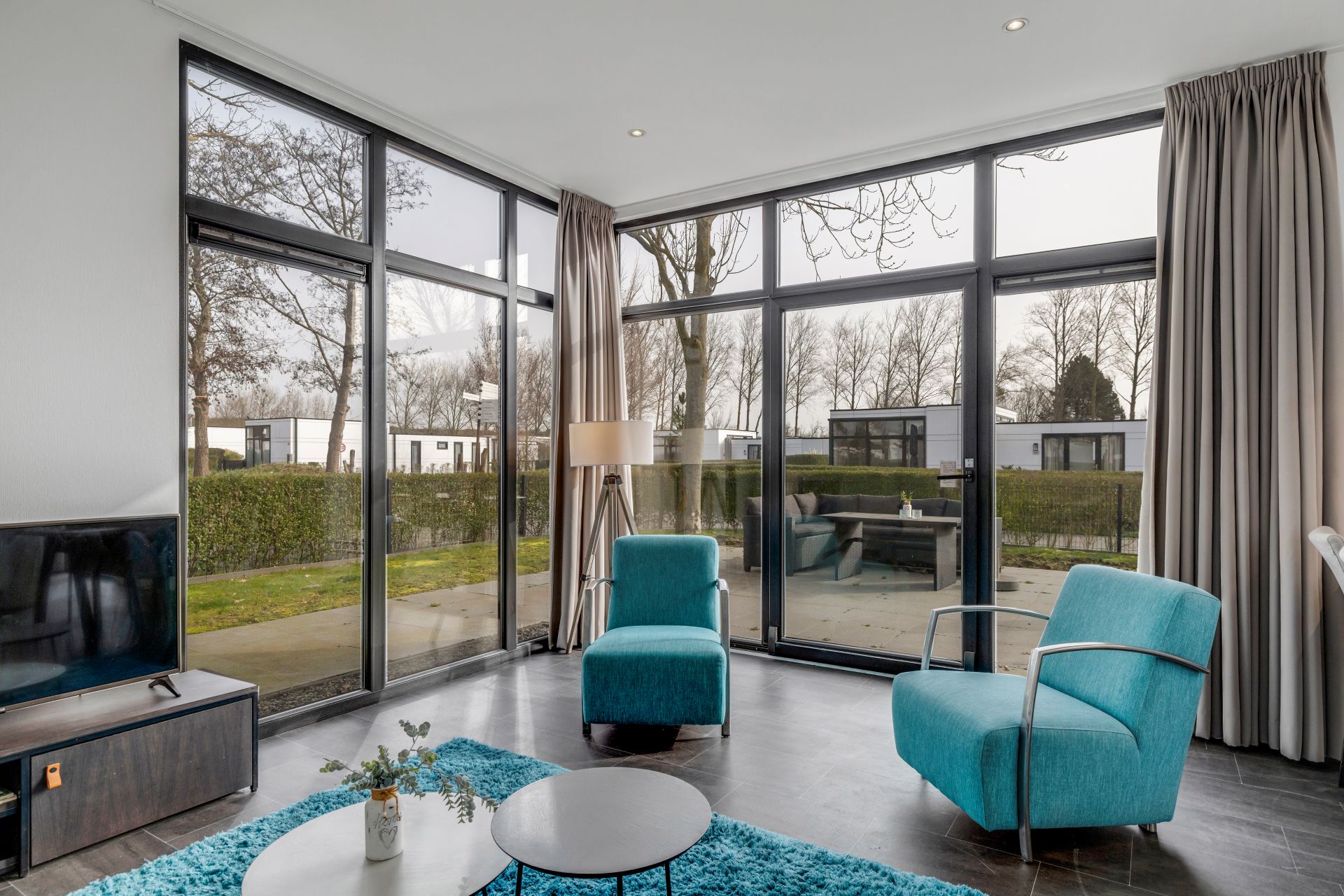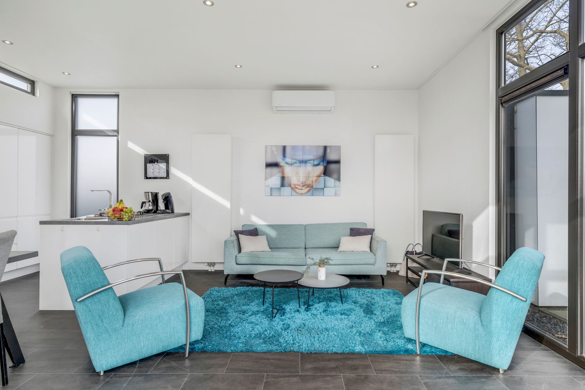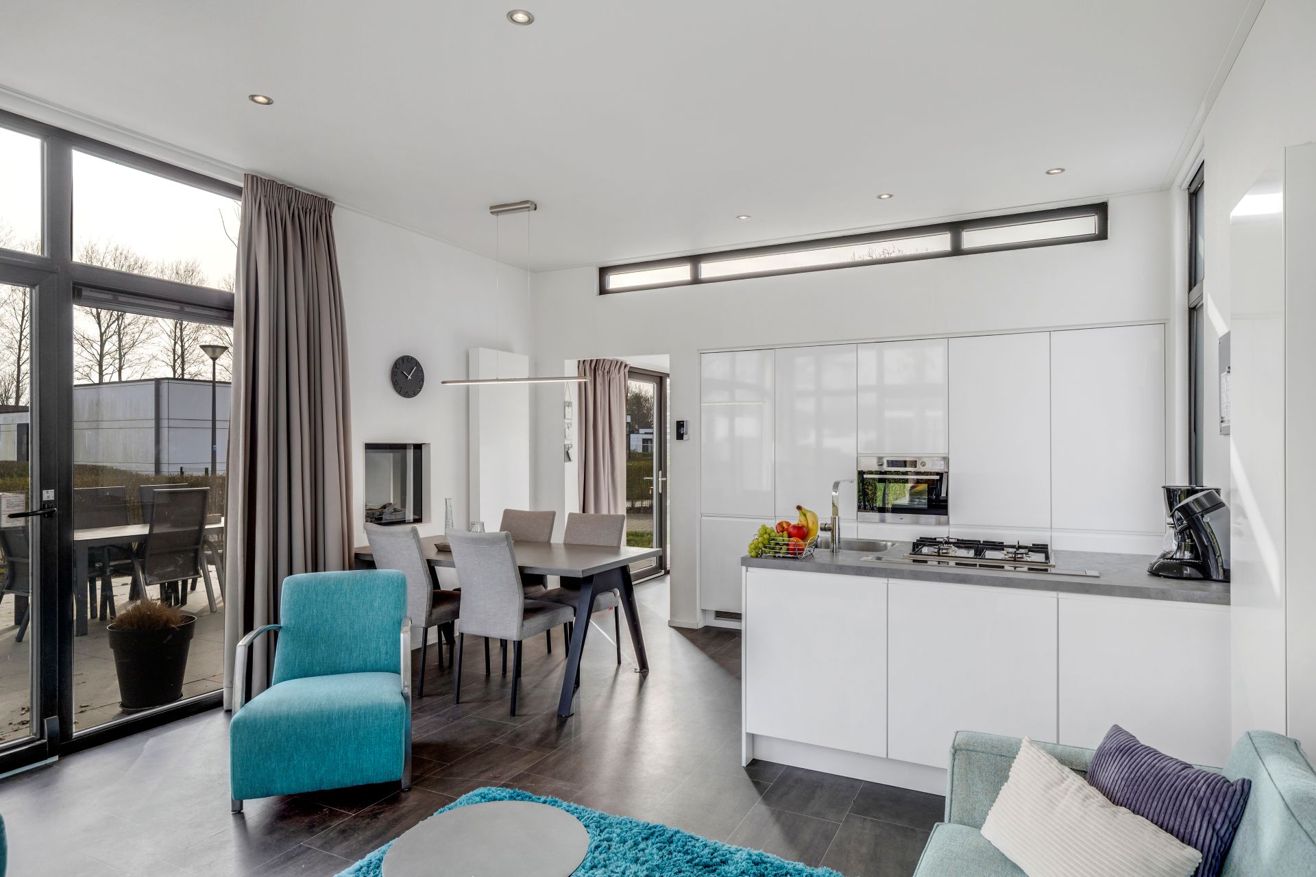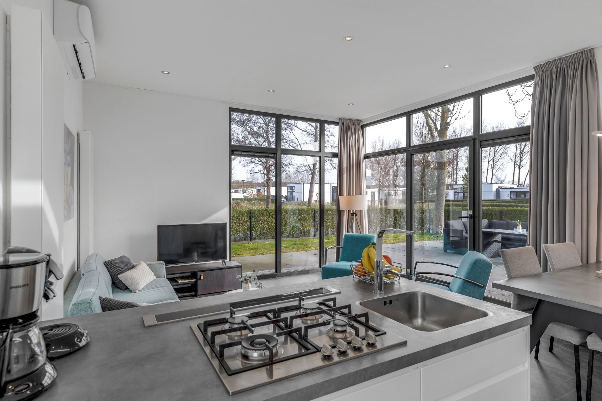 De lichte woonkamer met grote raampartijen zorgt voor veel natuurlijk licht en staat in open verbinding met de moderne keuken met kookeiland. De keuken is voorzien van diverse inbouwapparatuur, waaronder een combimagnetron, koelkast met vriesvak, vaatwasser en gaskookplaat. Daarnaast is de woning uitgerust met airconditioning voor extra comfort.