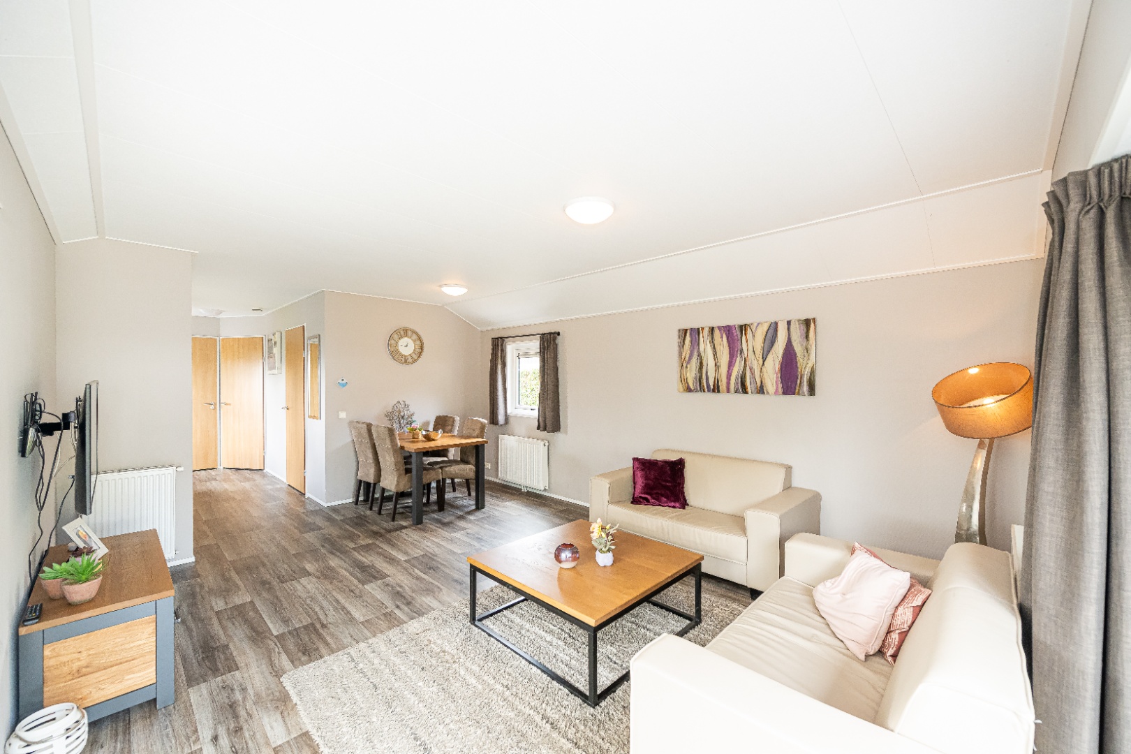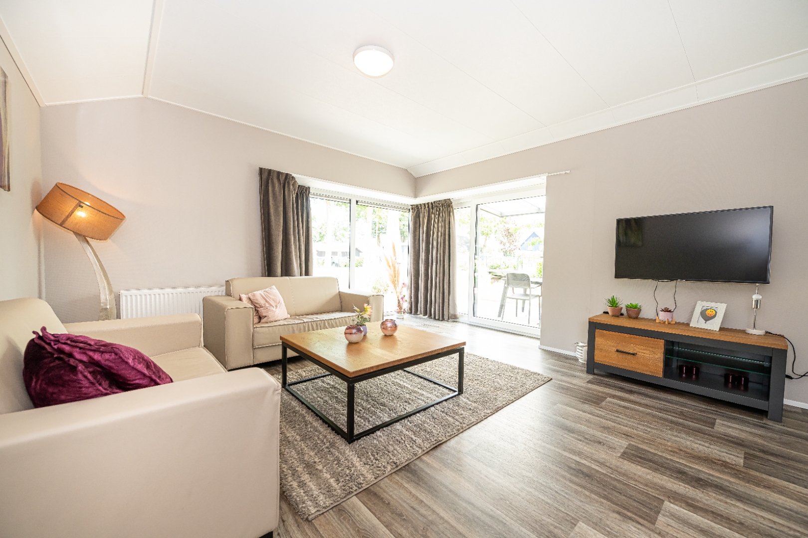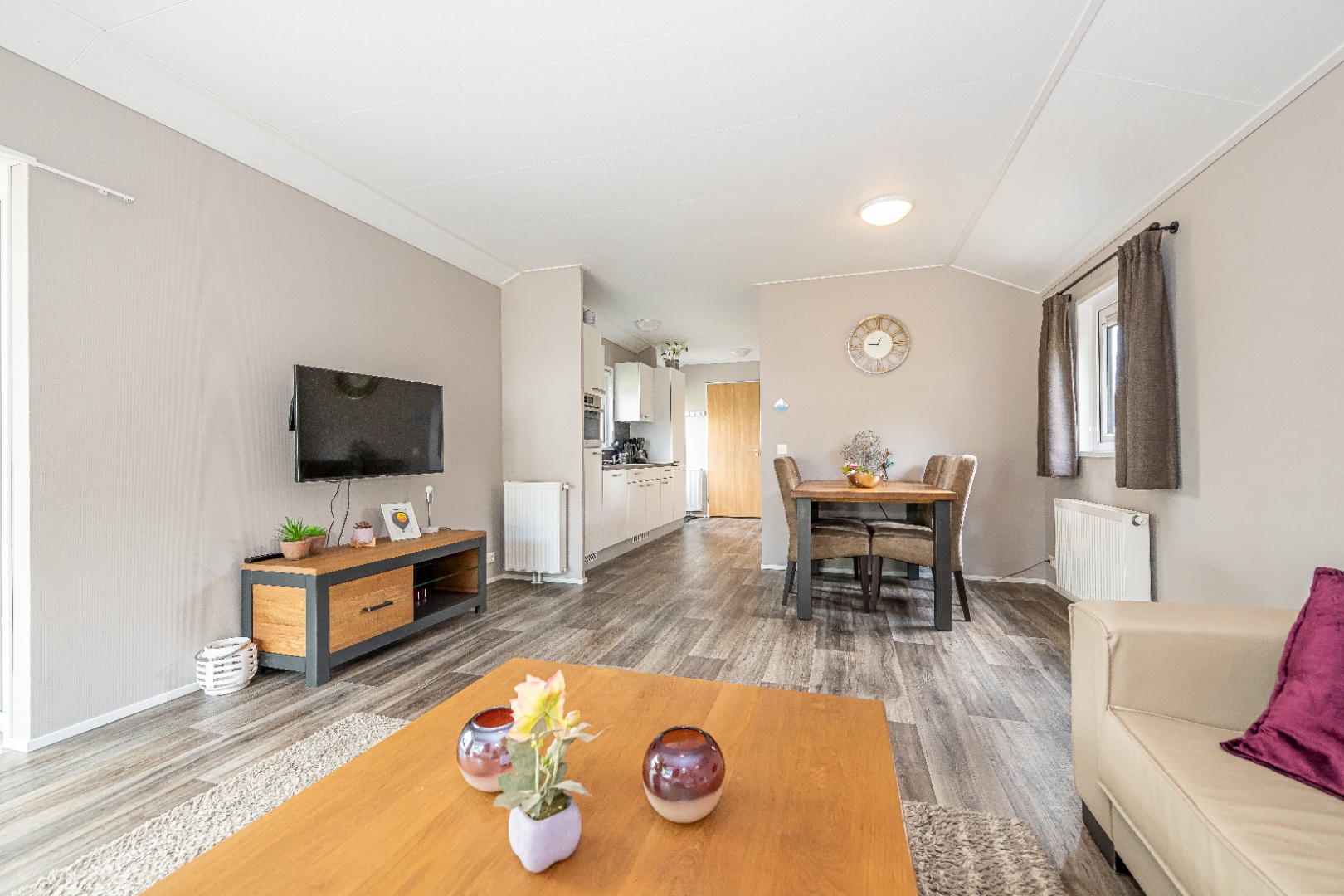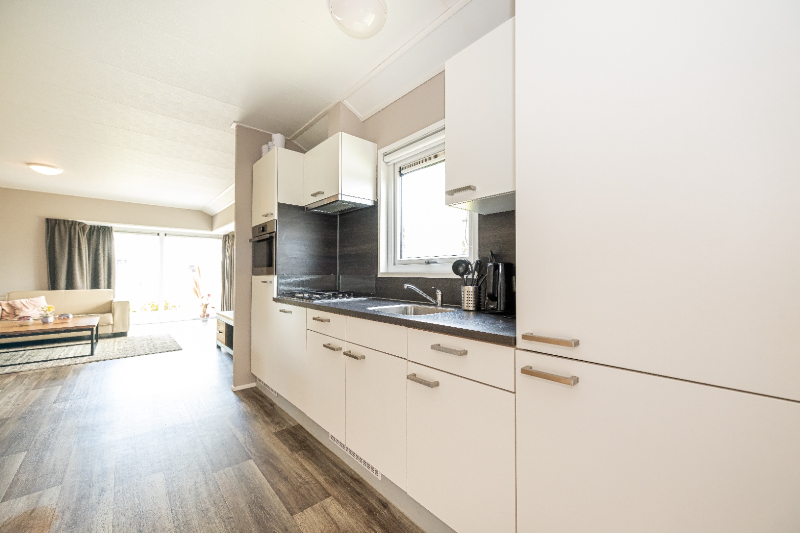De lichte woonkamer heeft grote raampartijen en biedt een open keuken voorzien van gaskookplaat, afzuigkap, koel-vriescombinatie, combimagnetron en vaatwasser. Een comfortabele zit- en eethoek maken het geheel compleet.