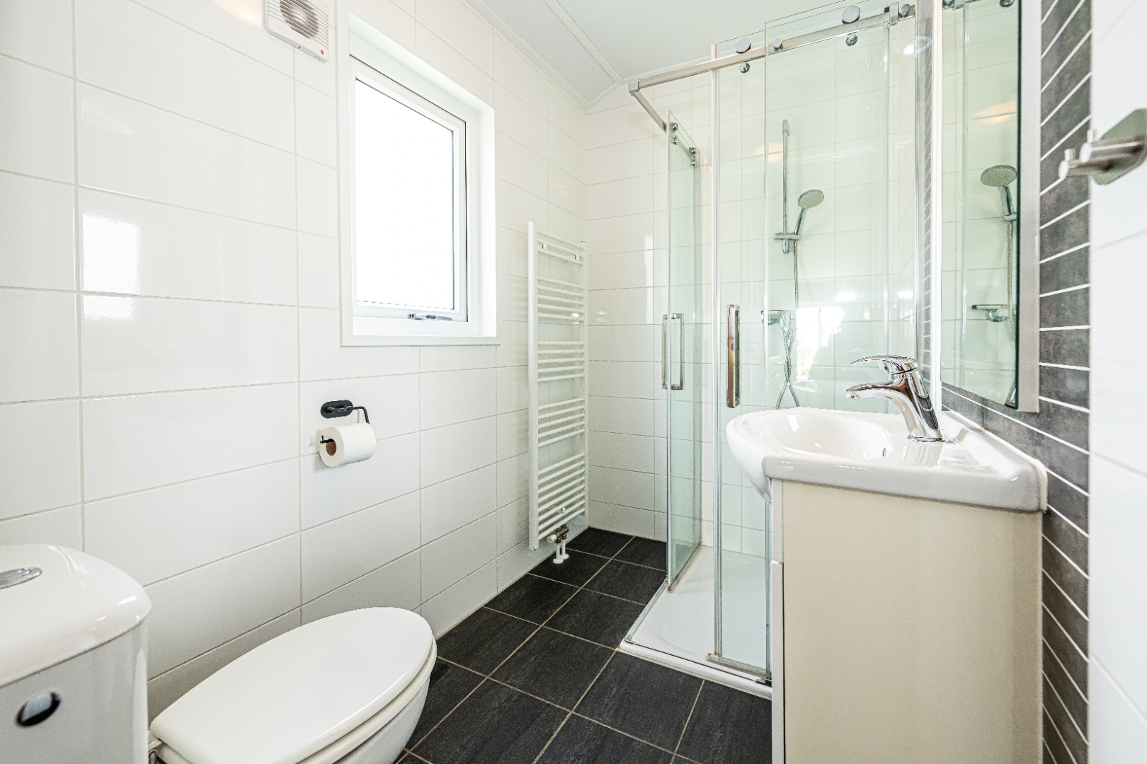 De woning beschikt over twee slaapkamers en een moderne badkamer met inloopdouche, wastafel, designradiator en toilet. Alles bevindt zich op de begane grond, wat het gebruiksvriendelijk maakt voor gezinnen en stellen.