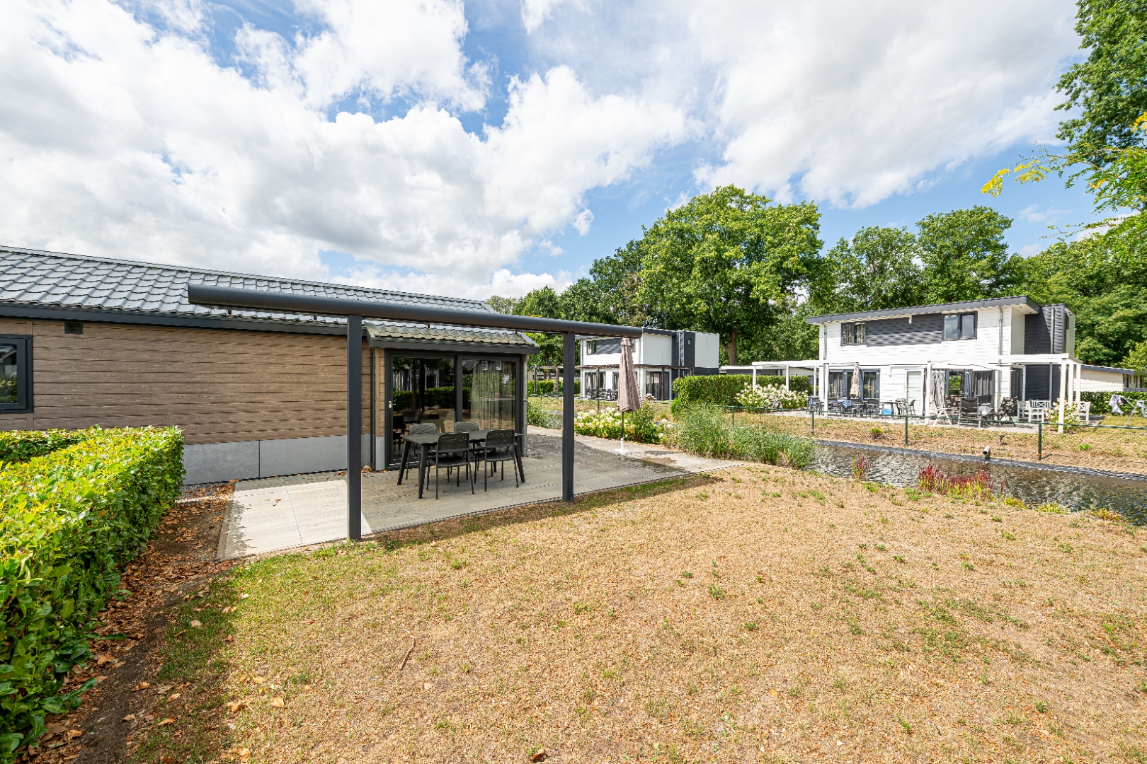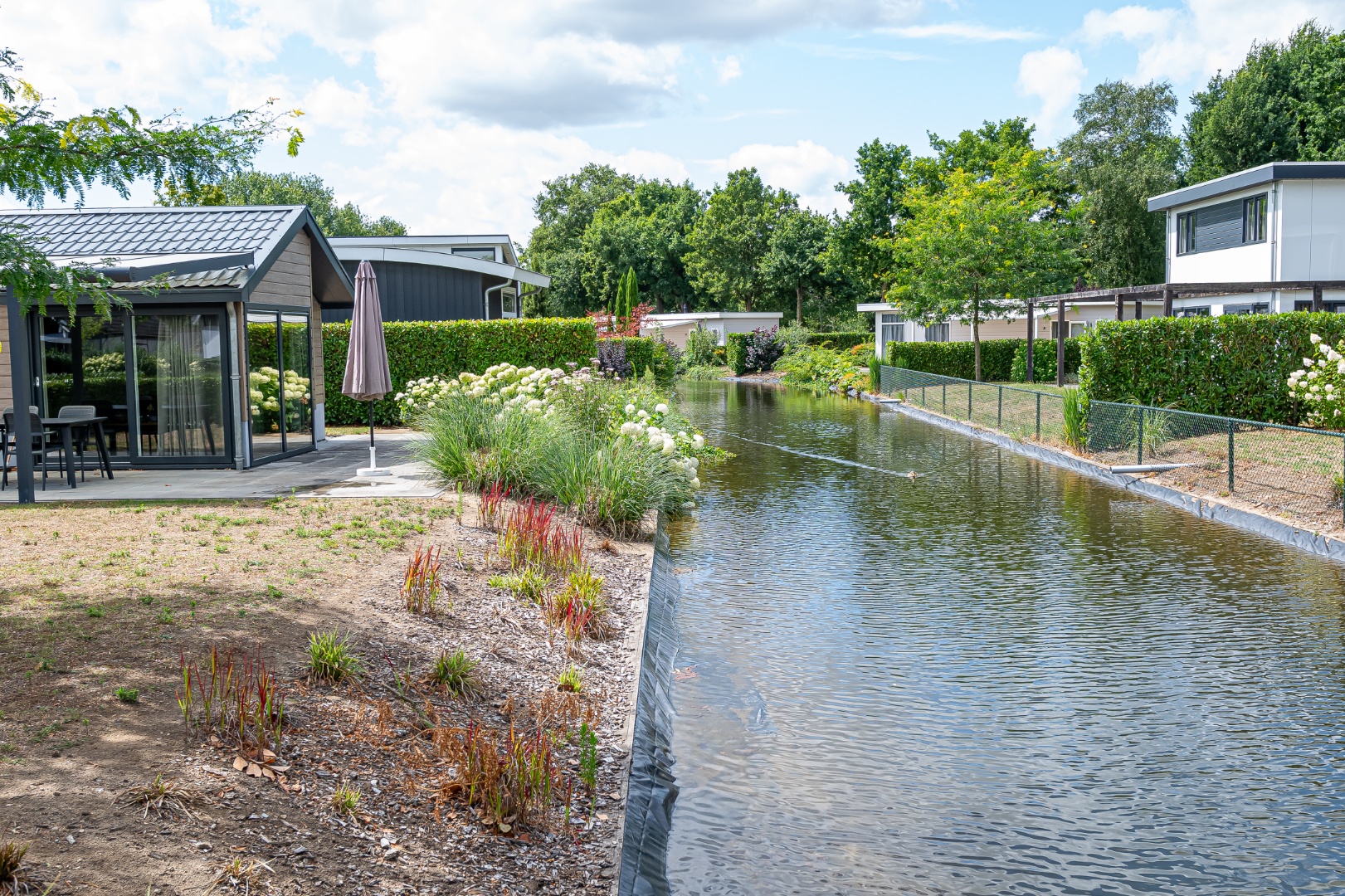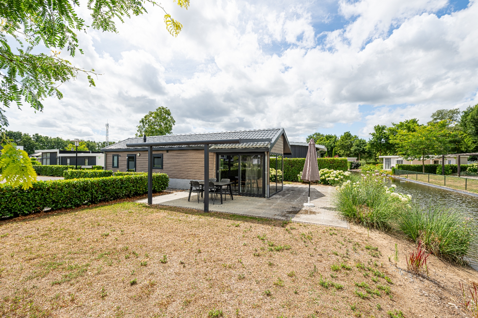 De ruime tuin grenst direct aan het water en is voorzien van een royale terrasoverkapping, zodat u het hele jaar door van het buitenleven kunt genieten.